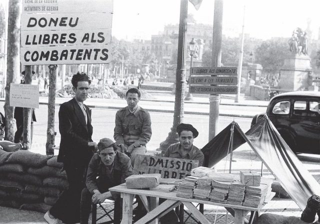 The sign in the photo taken in Barcelona in 1938 reads “give books to fighters”. The campaign collected reading material for anti-Fascist volunteers in the Spanish Civil War.