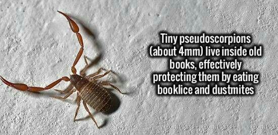 As a collector and seller of antiquarian and secondhand books, I often discover the remains of dead book scorpions. The tiny arachnids are actually pseudoscorpions and are the book lover’s friend and mostly unseen companions. Although they are harmless to humans, these ferocious little bugs devour pernicious booklice and dust mites that damage books. If you discover a live book scorpion don’t kill it, just gingerly place it in an old book.