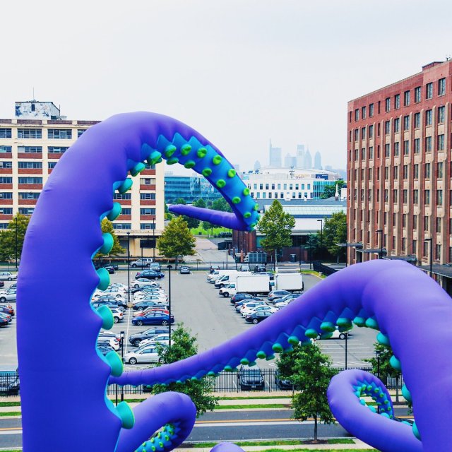British street artists Luke Egan and Pete Hamilton—aka Filthy Luker and Pedro Estrellos—visited the historic Philadelphia Navy Yard this week and installed a gigantic inflatable sculpture in an abandoned warehouse on the Delaware River waterfront. The twenty purple, blue , and green tentacles are part of a piece they call “Sea Monsters HERE” that will be on display until November 16,2018.