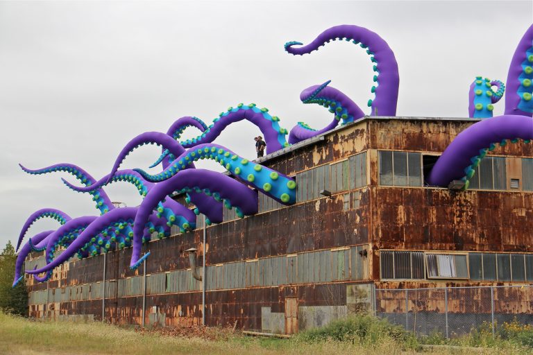 British street artists Luke Egan and Pete Hamilton—aka Filthy Luker and Pedro Estrellos—visited the historic Philadelphia Navy Yard this week and installed a gigantic inflatable sculpture in an abandoned warehouse on the Delaware River waterfront. The twenty purple, blue , and green tentacles are part of a piece they call “Sea Monsters HERE” that will be on display until November 16,2018.