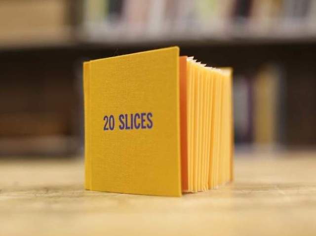 I’ve discovered some awfully cheesy literature over the years, but Ben Denzer’s 20 Slices is the most original work. Composed of twenty slices of individually wrapped actual American cheese* pieces and bound in bright yellow covers, the “book” was published in a limited edition of ten copies by Catalog Press. The “author” also runs the publishing company, which has issued such literary classics as $200 In Order, a book of two hundred $1 notes in order of serial number, and Stamp Compositions, 3000 postage stamps without any text. Then there is the iconic work 200 Fortunes a bound book of two hundred actual Chinese restaurant cookie fortunes. If you’re interested, Denzer’s website reveals more about the art book publications.
