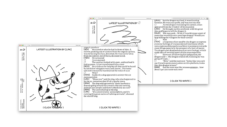 When you log-in to the Boook.Land you will be shown a continuous scroll of participant-generated text, along with the option to add your own writing or illustrations to the work in progress.