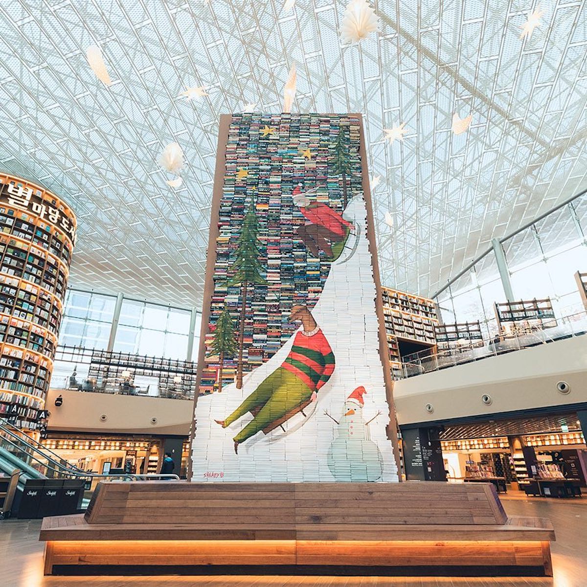 The Starfield Mall collaborated with artist Mike Stillkey , who specializes in making sculptures by stacking books. And to celebrate the Winter holidays, the latter has imagined a display that takes the form of a sculpture 9 meters high … composed of 14,000 books .