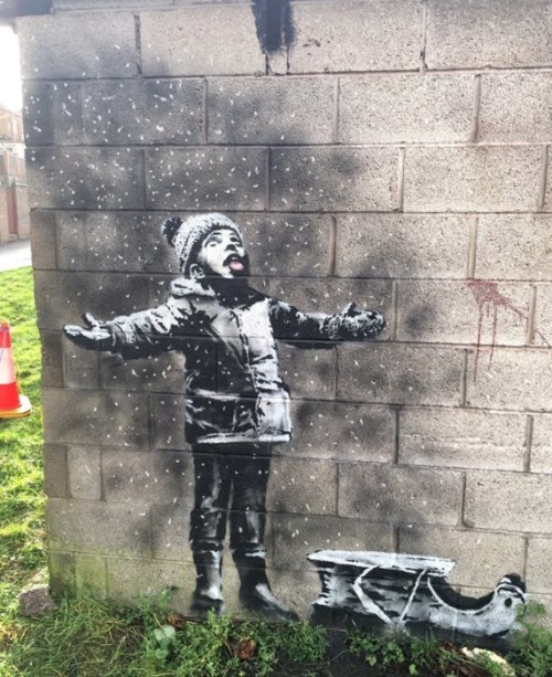 Banksy has confirmed that a two-sided mural on an out of the way garage in Port Talbot, Wales is his newest work. From one angle it appears to feature a child happily catching snow flakes. However, viewed from a slightly different angle it reveals ash falling from a dumpster fire. Commentary on a Brexit Christmas ? Or maybe just his take on the world this holiday season.