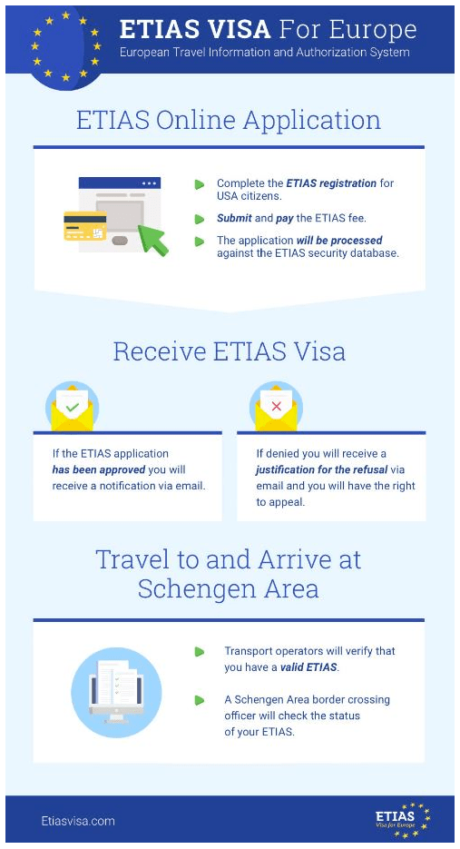 U.S. citizens 18 and older will need to secure the required visa for European travel by completing an online ETIAS registration form. Applicants will have to provide proof of a valid U.S. passport—valid for at least 3 months beyond their European visit—a credit card and an email account. There will be a €7 fee and they will need to answer questions on the following topics: