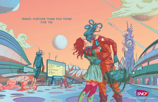 Those of you who stop by TBTP on a regular basis know that I have a soft spot for travel posters. So, of course I love these brilliant and colorful railway ads for SNCF. Illustrators Wenyi Geng and Olivier Bonhomme created the sci-fi/fantasy inspired posters to promote the French railway’s special €15 fares.
