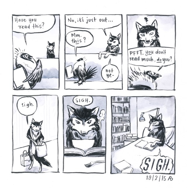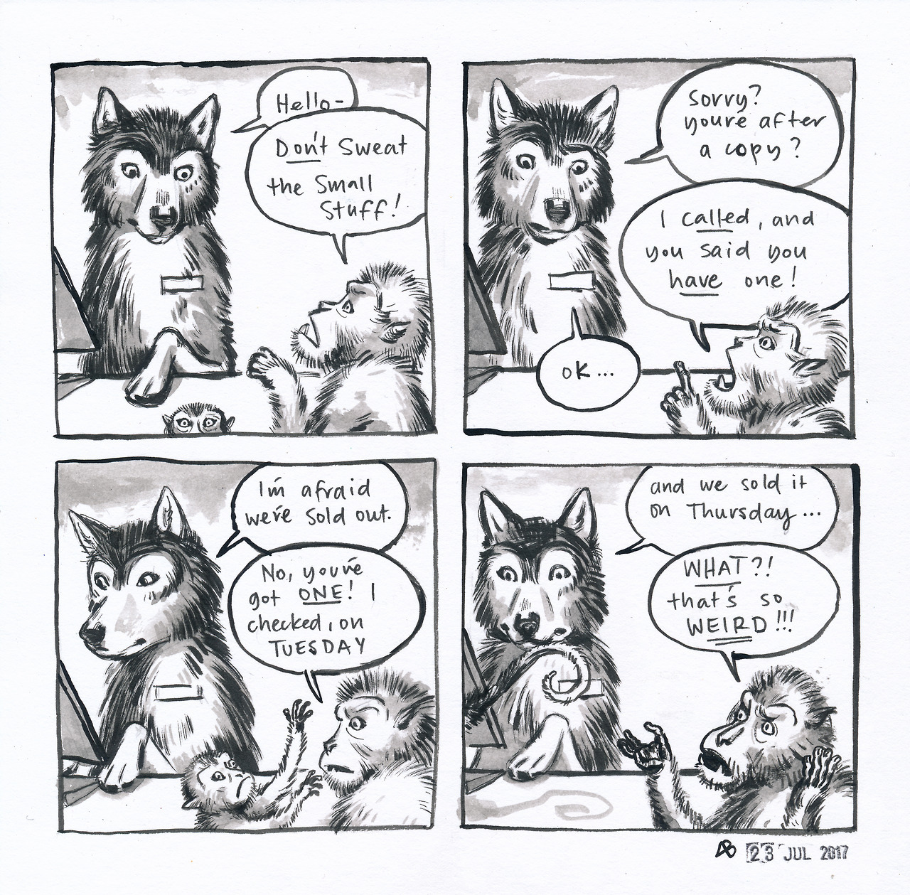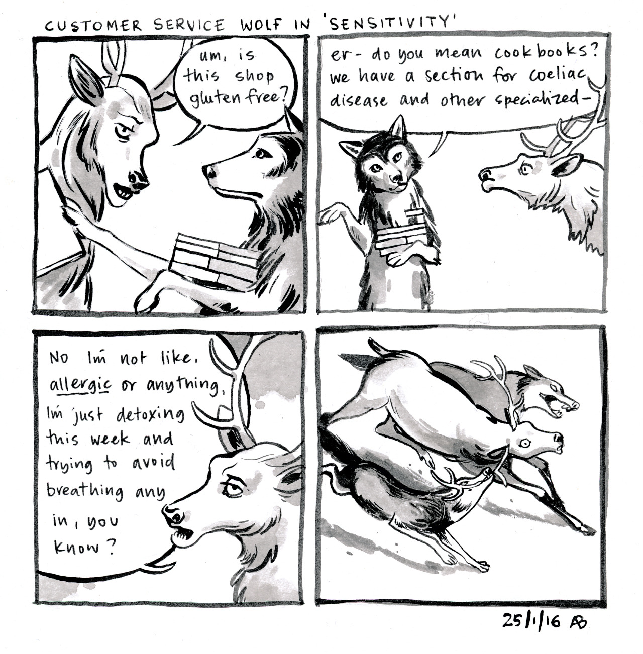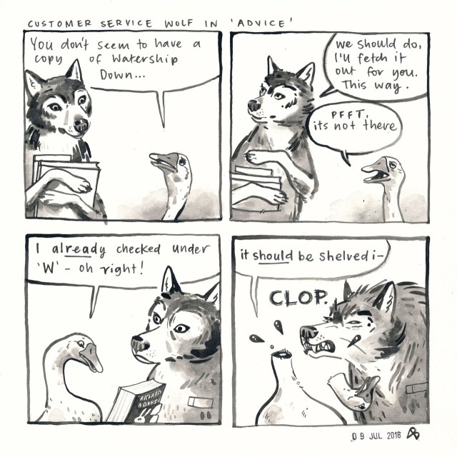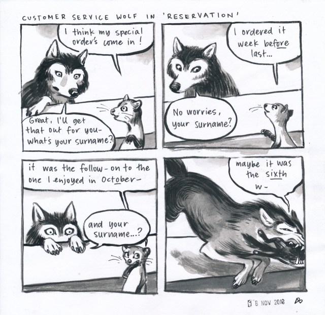You don’t have to be a bookseller to grok the exasperating experiences that bookstore owner Anne Barnetson hilariously explores in her ongoing comic series called Customer Service Wolf. The online comic documents the frustrations that most retail workers suffer through every day, but covers the specific woes that booksellers cope with.
