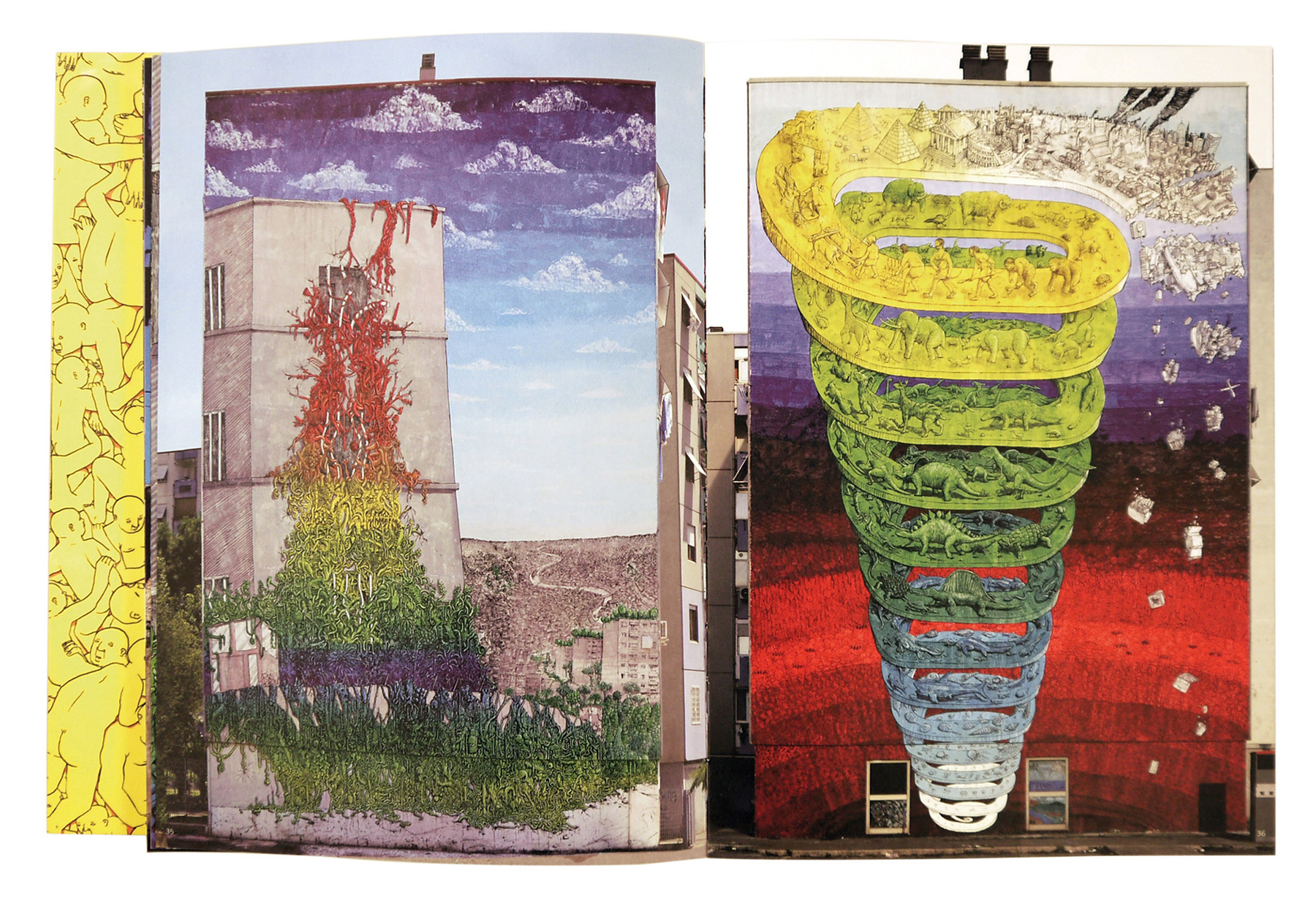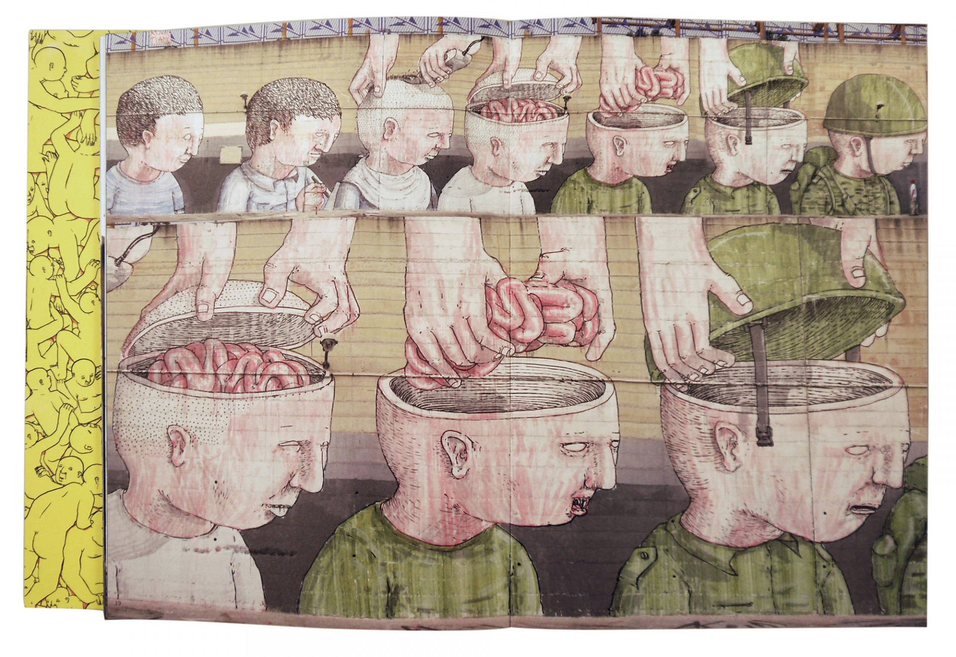Those of you who regularly visit this humble blog are all too well aware that I am an enormous fan of street art and basically obsessed with books. So when I stumbled upon the book Minima Muralia, which explores more than 200 large murals painted by the Italian artist known as Blu , I was hooked. The book covers every major piece created by the pseudonymous Bologna-based street artist over the first 15 years of his career. This special edition of the book was released with a 32-page zine, two posters, and a specially-designed book casing from Zooo Print & Press.