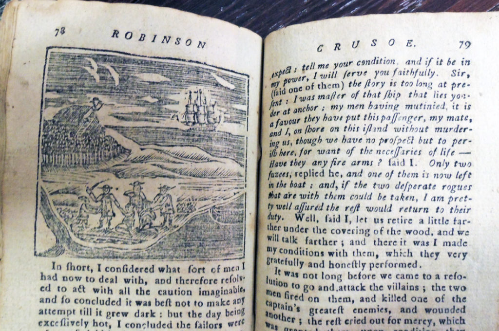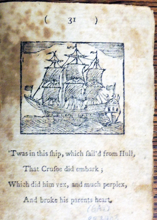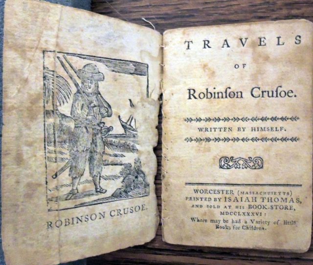 Daniel Defoe’s Adventures of Robinson Crusoe was first published on April 25, 1719, and before the end of the year had run through four editions. An abridged children’s version was published in 1784 in Boston, printed and sold by N. Coverly, price three pence.