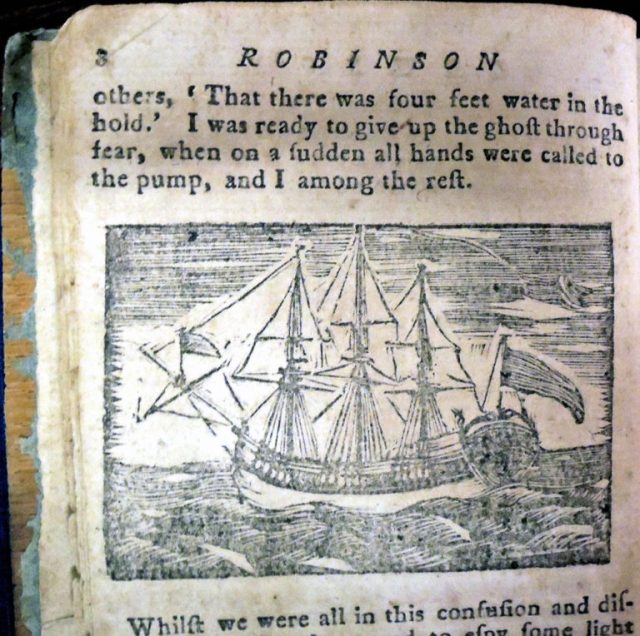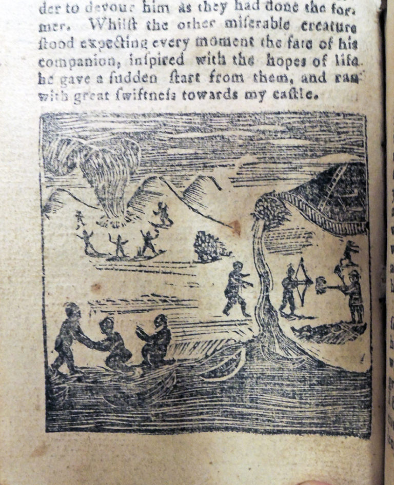 Two years later Isaiah Thomas (1661-1731) printed and sold the novel from his bookshop in Worcester, Massachusetts, as “Travels of Robinson Crusoe.” The book was as big a success for Thomas in the United States as it had been in England. Here are some plates from the 1786 and 1795 editions.