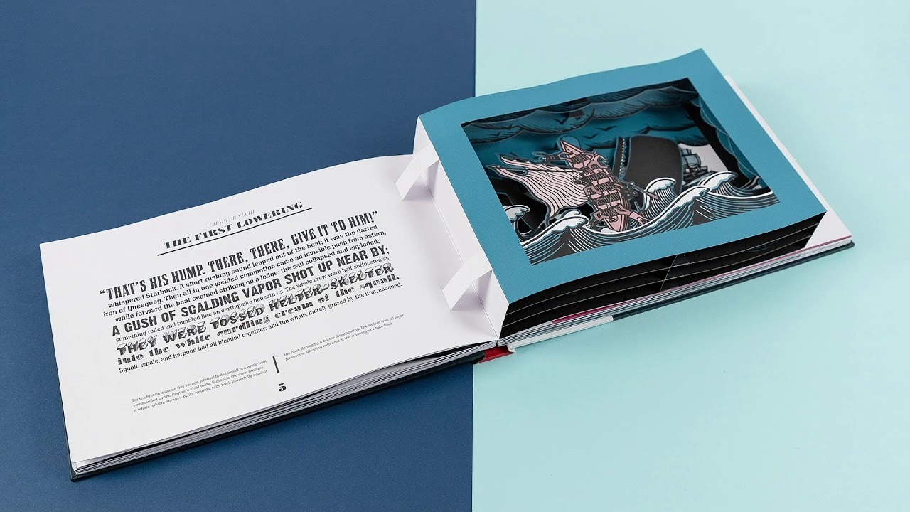 With all of the hullabaloo about local literary star Walt Whitman’s 200th anniversary celebrations, I completely missed the fact that it is also the 200th birthday of Herman Melville. To celebrate the anniversary, Chronicle Books has published this splendid pop-up book version of Moby-Dick. This re-telling of the iconic 19th century American novel portrays key moments from the book with lincut artwork. The illustration by Gerard Lo Monaco and Joëlle Jolivert are accompanied by select quotations from the novel and page note offering context to the plot.