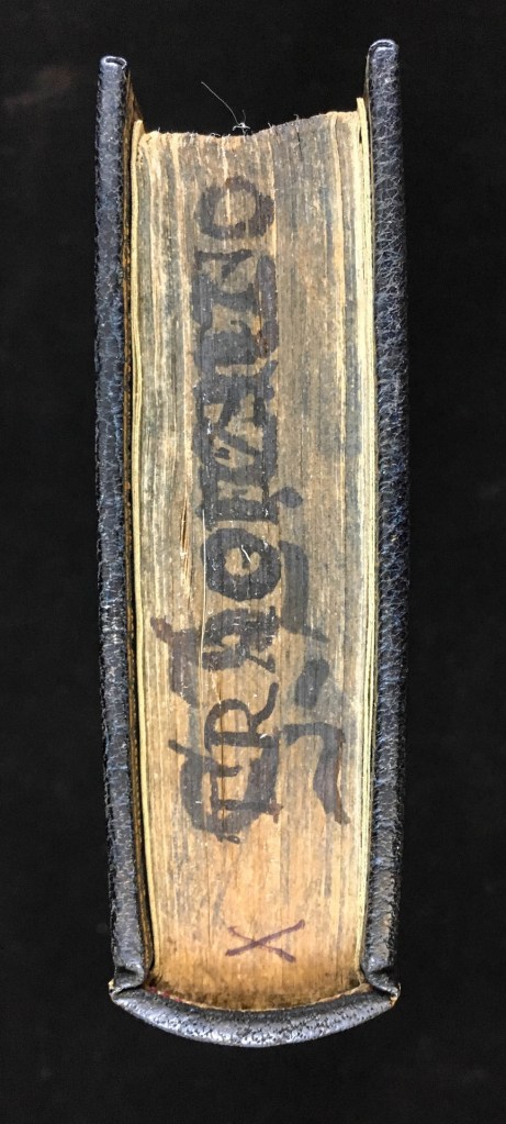 These two books were printed at the historic Aldine Press in Venice. Founded by Aldus Manutius in 1495, it was among the most prominent and successful printing houses of the time. These works date from the early 1500s and feature the iconic dolphin and anchor printer’s device. Manutius was also the first to use Italic type, which can be seen here on the title page of one of these works.