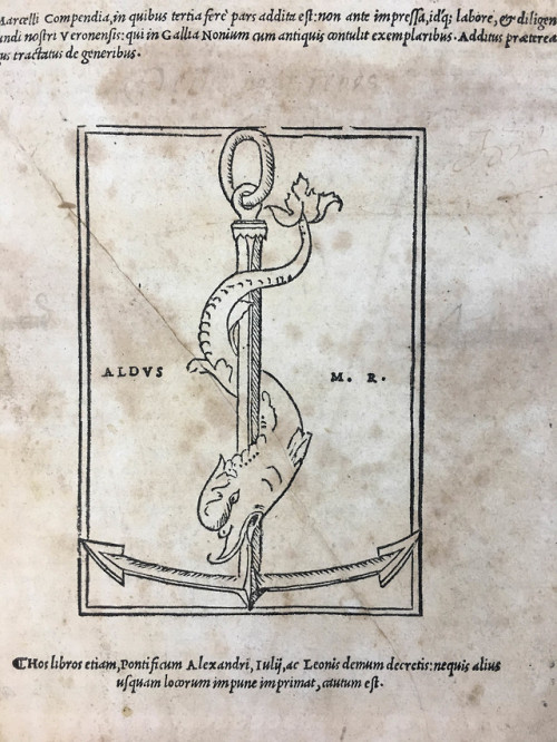 These two books were printed at the historic Aldine Press in Venice. Founded by Aldus Manutius in 1495, it was among the most prominent and successful printing houses of the time. These works date from the early 1500s and feature the iconic dolphin and anchor printer’s device. Manutius was also the first to use Italic type, which can be seen here on the title page of one of these works.