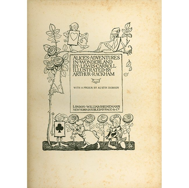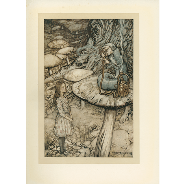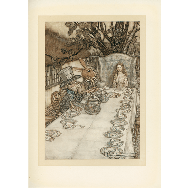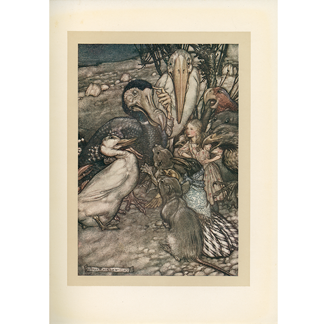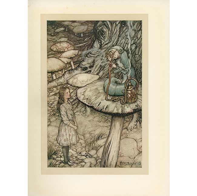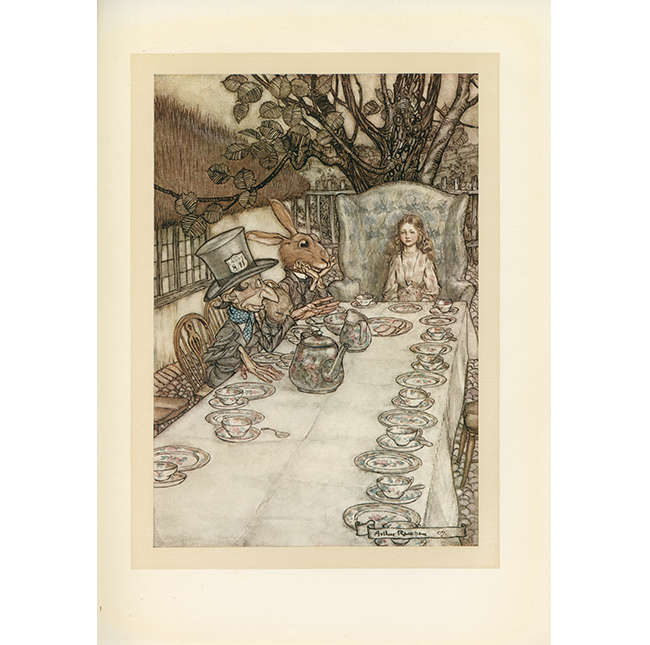 This is one of the first non-Tenniel illustrated Alices issued when British copyright expired in 1907. Pictured in a white pinafore decorated with pale pink roses and grey tights, Rackham’s Alice appears both thinner and taller than Tenniel’s heroine. Muted colors, especially the browns, lend an eerie aspect to Rackham’s drawings of the Wonderland characters and landscape. But if I could have any edition other than a Tenniel illustrated first, it would be this Rackham.