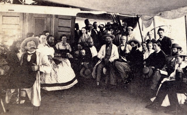 The voyage of the Quaker City was well documented by an onboard professional photographer. Some of William E. James’ images are included in the exhibition, including the one below featuring Twain. The author is seated on the floor next to the man holding a hat.