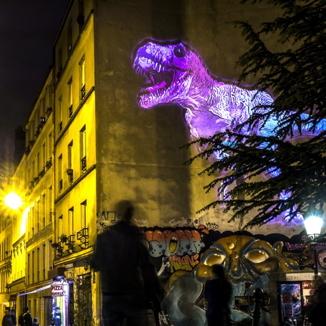 I know the big name dinosaurs—Tyrannosaurus, Allosaurus, Velociraptor, etc.—but that’s about the extent of my grasp of Dinosauria. However, my nephew Cameron is a budding paleontologist at the age of two (yes, 2) and he constantly schools me on the identification and naming of his favorite creatures. The precocious toddler has been obsessed with dinos since he was an infant. When we get together he shares his favorite books, toys, and videos . Cameron not only has an impressive ability to recognize species, but he can accurately pronounce names, such as Archaeoceratops, Diplodocus, Pachycephalosaurus. This past weekend, I was able show him some contemporary dinosaurs stalking the streets of Paris .