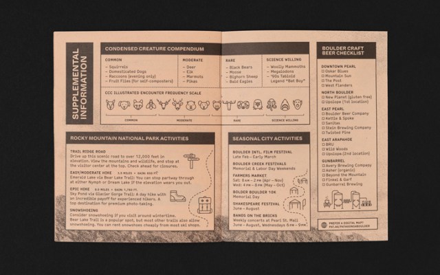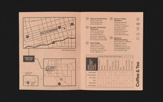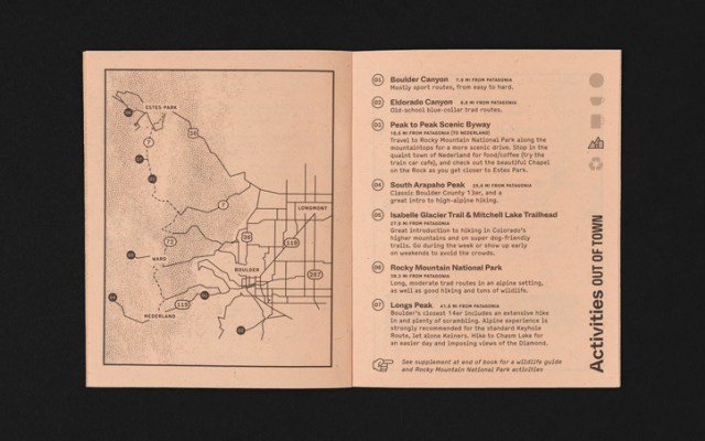 The popular American outdoor clothing company Patagonia commissioned the local design studio Cast Iron to create a city guide to its home town of Boulder, Colorado. The neat little travel guide covers the highlights of America’s “happiest city” from local coffee shops, restaurants, and hangouts to hiking trails and recreational opportunities. The real highlight of the pocket-sized guide is the innovative use of algae-based black ink and Kraft paper instead of the usual petroleum derived print products.