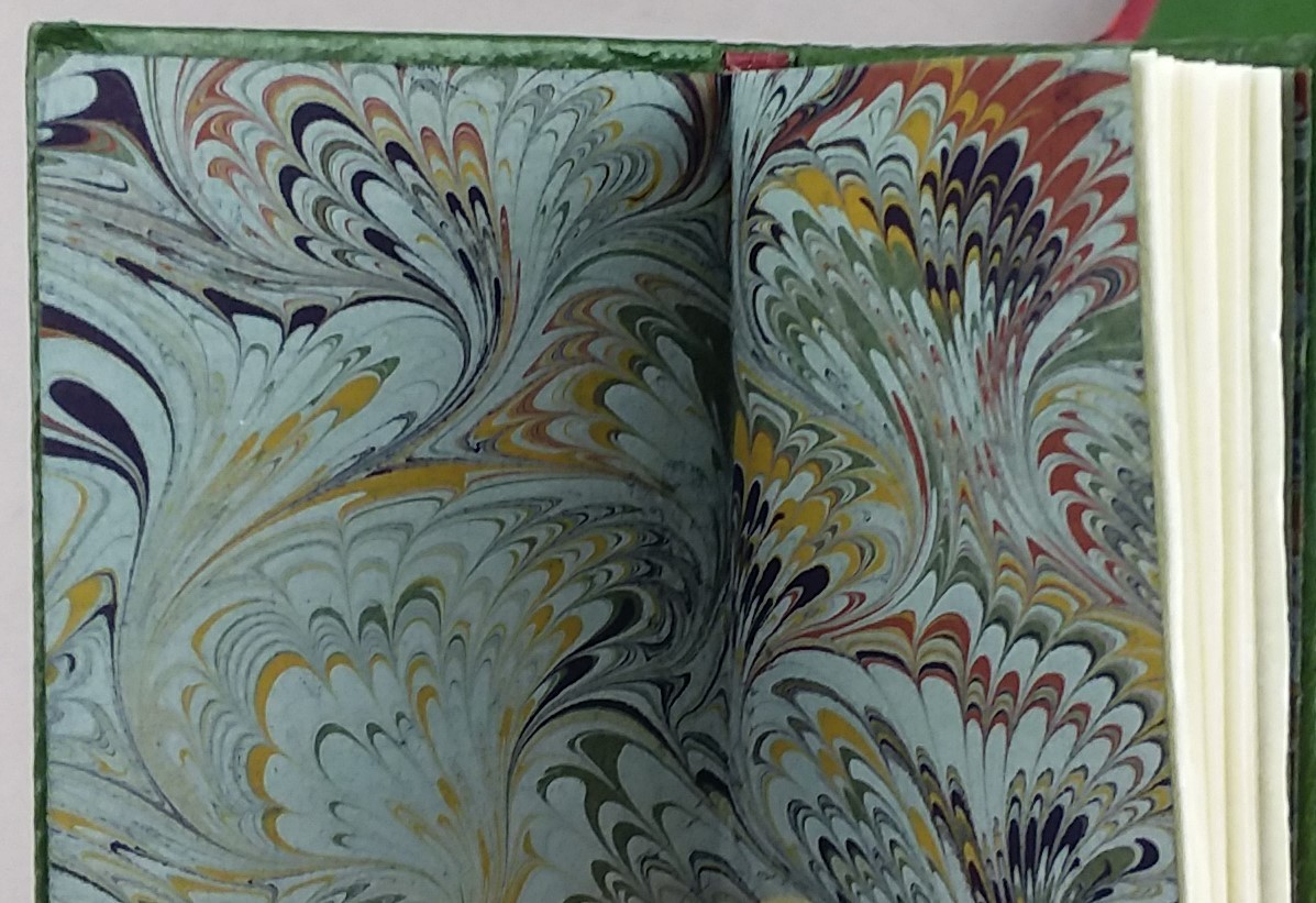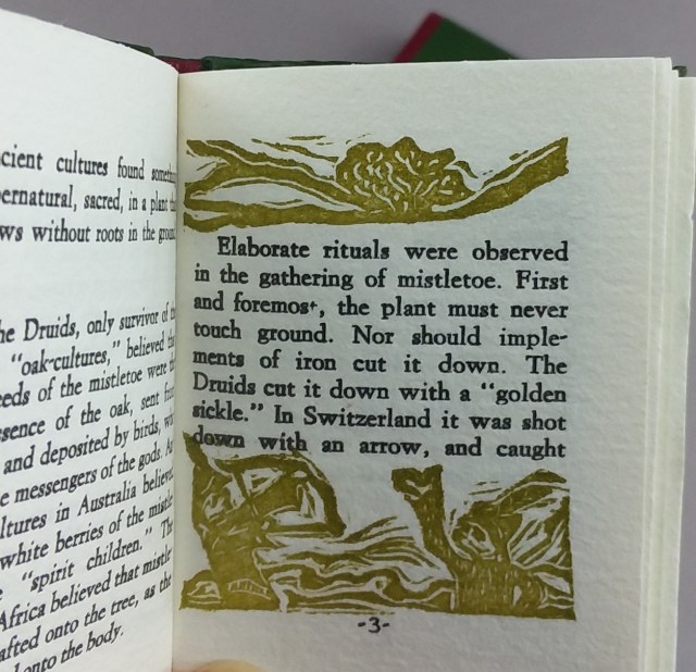 “Mistletoe was printed letterpress with 6 pt. Deepdene type, and linoleum blocks, on dampened paper handmade at Barcham Green. Design, printing, binding, linoleum blocks, and marbling hand done by M.P. Adams.“ –Colophon