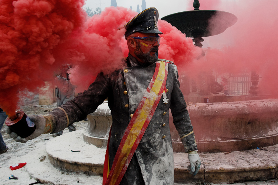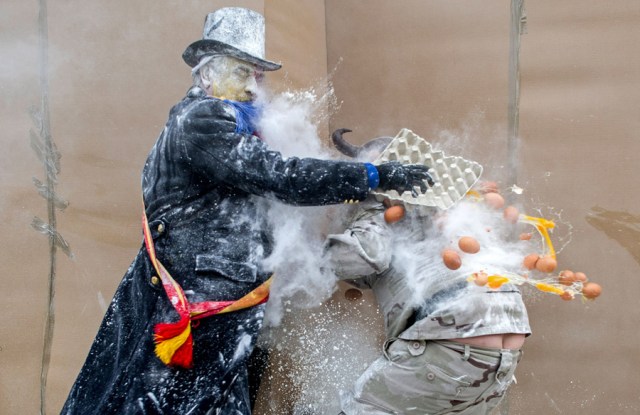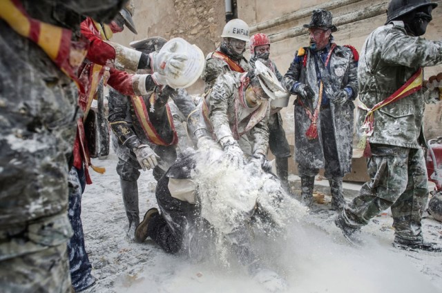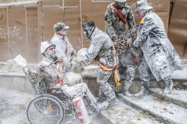 In 1981 the Spanish town of Ibi revived the 200 year-old tradition of the Els Enfarinats Festival. On December 28th each year a mock war takes place around the town hall. A group of local married men, called “els Enfarinats,” pelt each other with eggs, flour, fireworks, fire extinguishers, and more, in a mock coup to take over Ibi. The purpose of the insurrection is to impose and attempt to enforce silly new laws. Another group of men known as “la Oposicio” try to restore order and put down the uprising. At the end of the festivities, any money collected in fines for violating the new laws is donated to charity.