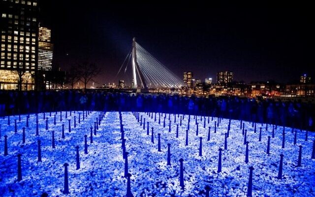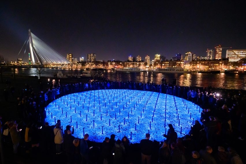 A temporary holocaust monument titled Levenslicht (Lifelight) created by artist Daan Roosegaarde lights up Rotterdam with 104,000 luminescent memorial stones that represent the 104,000 Dutch holocaust victims of the Nazis during WWII. The monument, which recalls the Jewish custom of placing stones on gravestones to honor the deceased instead of flowers, comprises specially developed rocks with fluorescent pigments that can light up every few seconds by using invisible ultraviolet light. The memorial was inaugurated in Rotterdam on January 16, 2020, and will then travel from January 22 to February 2, 2020, to 170 municipalities in the Netherlands.
