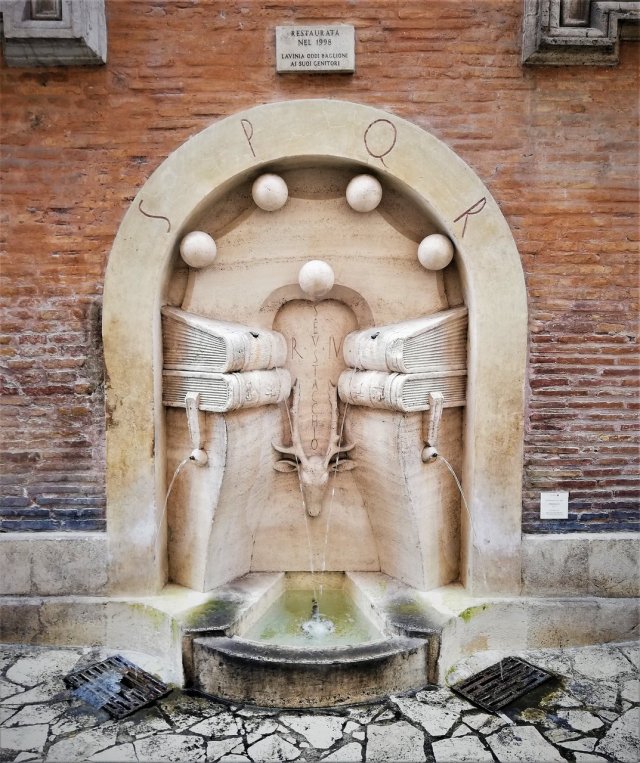 The Fontana dei Libri is characterized by an arched niche, and in the center you can see the head of a deer, a symbol of the Rione di Sant’Eustachio, with the water that flows from four points on the four books. Two nozzles come out from the upper books while two others from the bookmarks in the central part of the sculpture, symbols of knowledge that flows relentlessly from the size of the books.