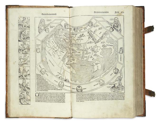 Written in Latin by the humanist and collector Hartmann Schedel, it was then printed by Anton Koberger in 1493 in Nuremberg. The woodcut illustrations and maps were created in the workshop of Michael Wolgemut, who employed his son-in-law Albrecht Dürer. The original version was printed in 1500 copies. A German edition, translated by Georg Alt, was also published by him, proof of a desire to disseminate knowledge in the vernacular. To date, around 400 copies in Latin and 300 in German have survived, making it one of the best preserved incunabula.