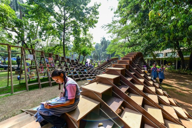 The peaceful library is an impressive set of undulating wooden structures packed with hundreds of books on 40 meters of shelving.The shady, serpentine outdoor reading room is only temporary, but aims to encourage literacy and a love of books.
