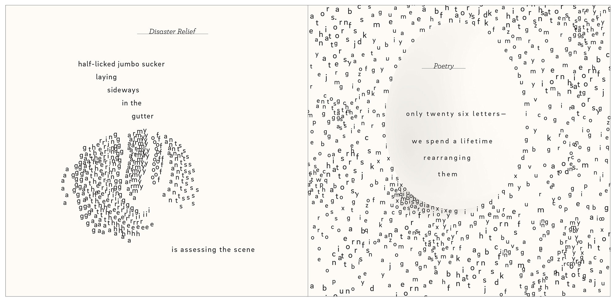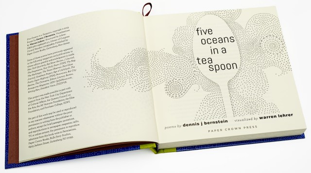 Five Oceans in a Teaspoon is a collaboration between artist/writer Warren Lehrer and poet/investigative journalist Dennis J Bernstein (Paper Crown Press, 2019) that reunites the oral and pictorial traditions of storytelling with the printed page.