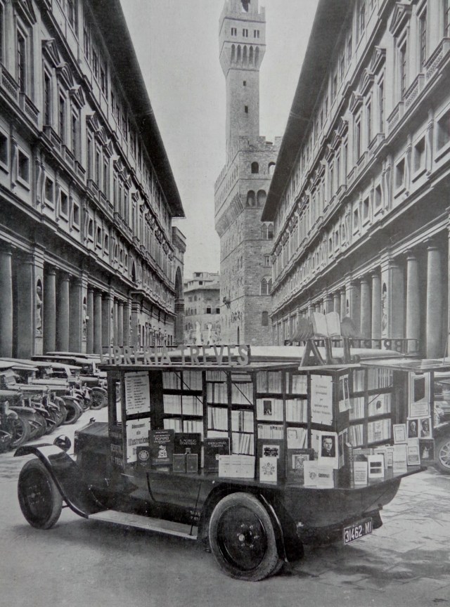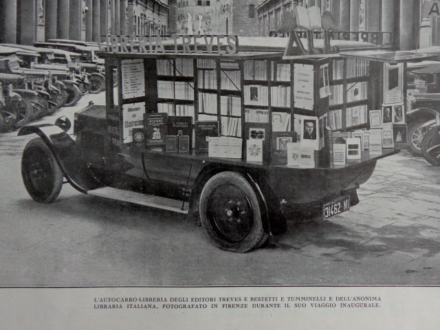 The early 1920s bookmobile was actually publisher’s method of selling books to the public, not a library’s program to get books to more citizens. Treves, in the photo’s caption, refers to Emilio Treves (1834-1916), the founder, editor, and publisher of L’Illustrazione Italiana. This publisher/bookseller model for book mobiles seems to have been a mostly Italian phenomenon not found here in North America.