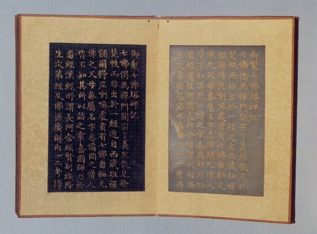 This book records a Buddhist text given to the Qianlong emperor by a Panchen Lama from Tibet. The calligraphy was written by the court official Liang Guozhi (1723–1774) then engraved into the jade pages and painted gold.