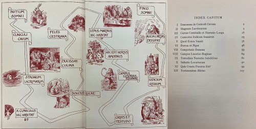 Another notable feature of this edition is the end papers, which are printed with a mind-map of Alice’s adventure. Following the thread and starting with the upper right corner, there are “initium somnii” (the beginning of the dream), “cuniculi cavum” (the rabbit hole), “stagum lacrimarum” (the pool of tears) and so forth. Although the “index capitum” (right), the table of contents (distinct from the mind-map), is provided by Carruthers, I personally enjoy the game-board-like one, which is more playful as well as enables its readers to easily connect the Latin title and the picture aside.