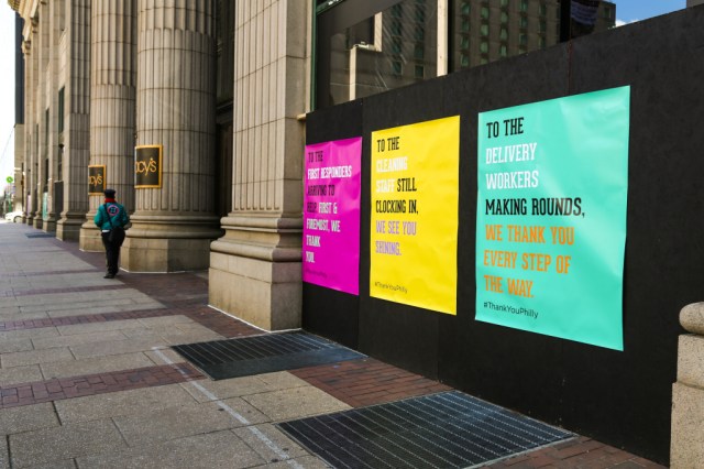 This past week, Philadelphia has used a number of those plywood panels on boarded up businesses around the city to post messages of gratitude to Philly’s essential workers.