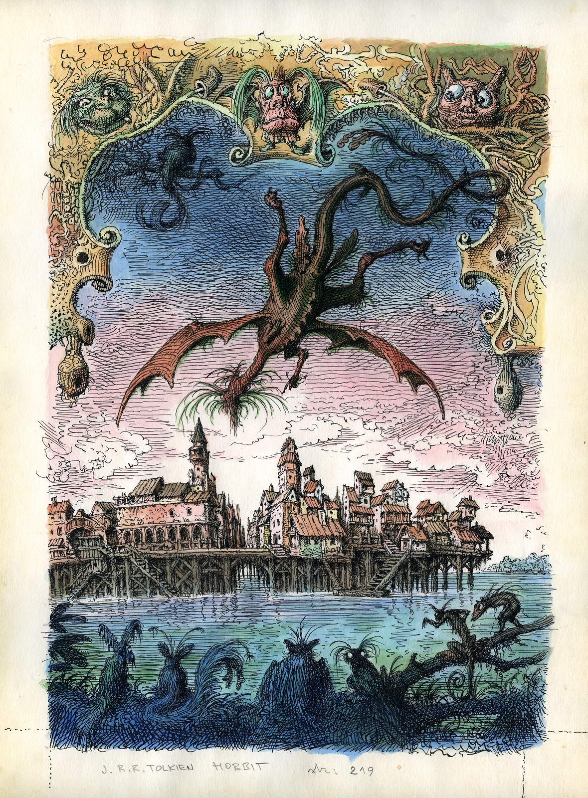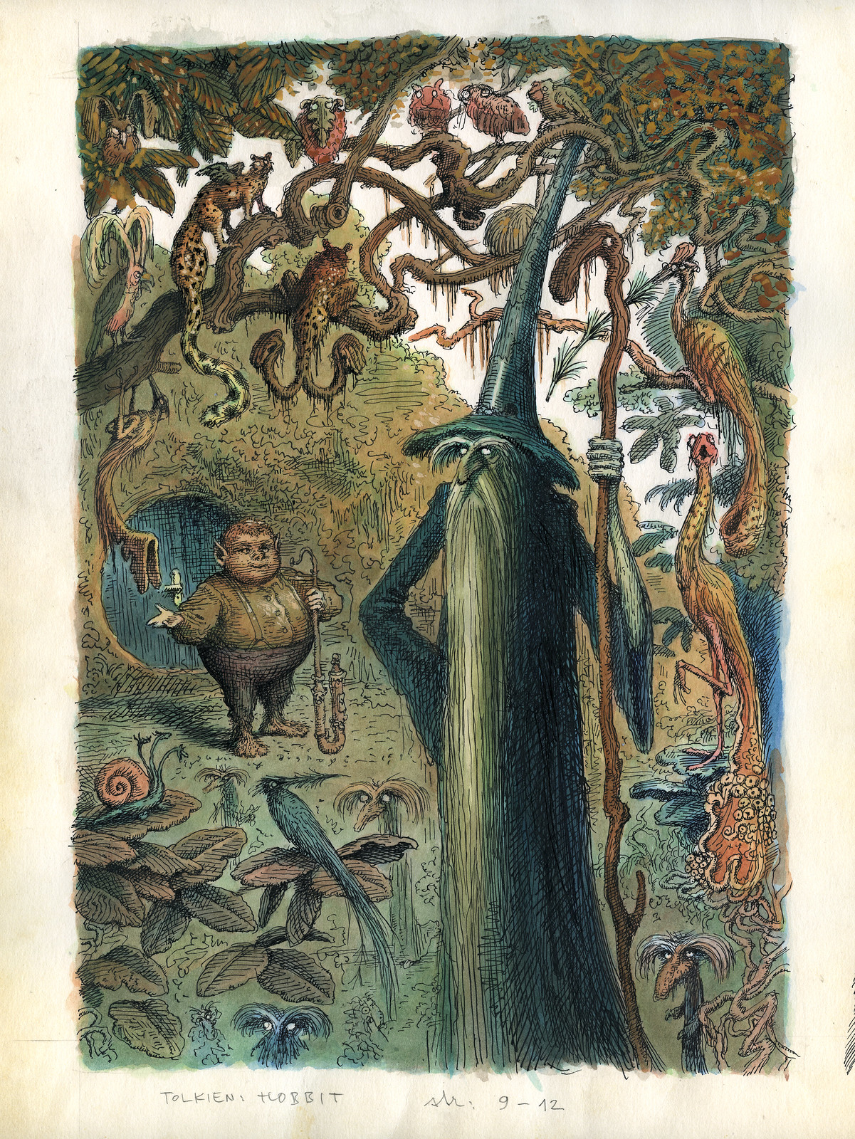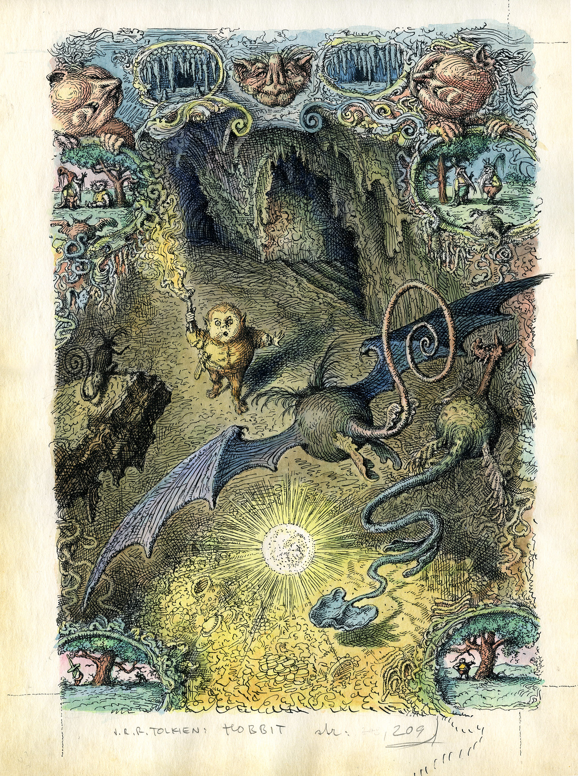 Slovak illustrator Peter Klúcik was commissioned to illustrate a new version of J R R Tolkien’s The Hobbit in 1988. For the project he created 40 illustrations that were rich in detail and quite different from previous works for Tolkien books. Unfortunately, the publishing house commissioning the illustrations lost the right to publish the book. A second publisher approached him, but only for the book’s cover. Then a third publishing house bought the artwork, but also failed to secure rights to the book. So for the last three decades, Klúcik’s wonderful Sendakesque illustrations have been orphaned.
