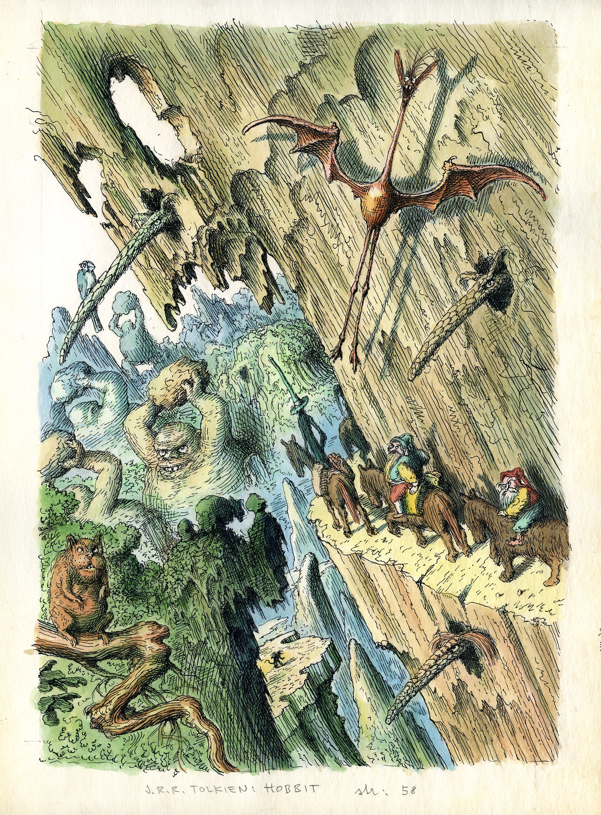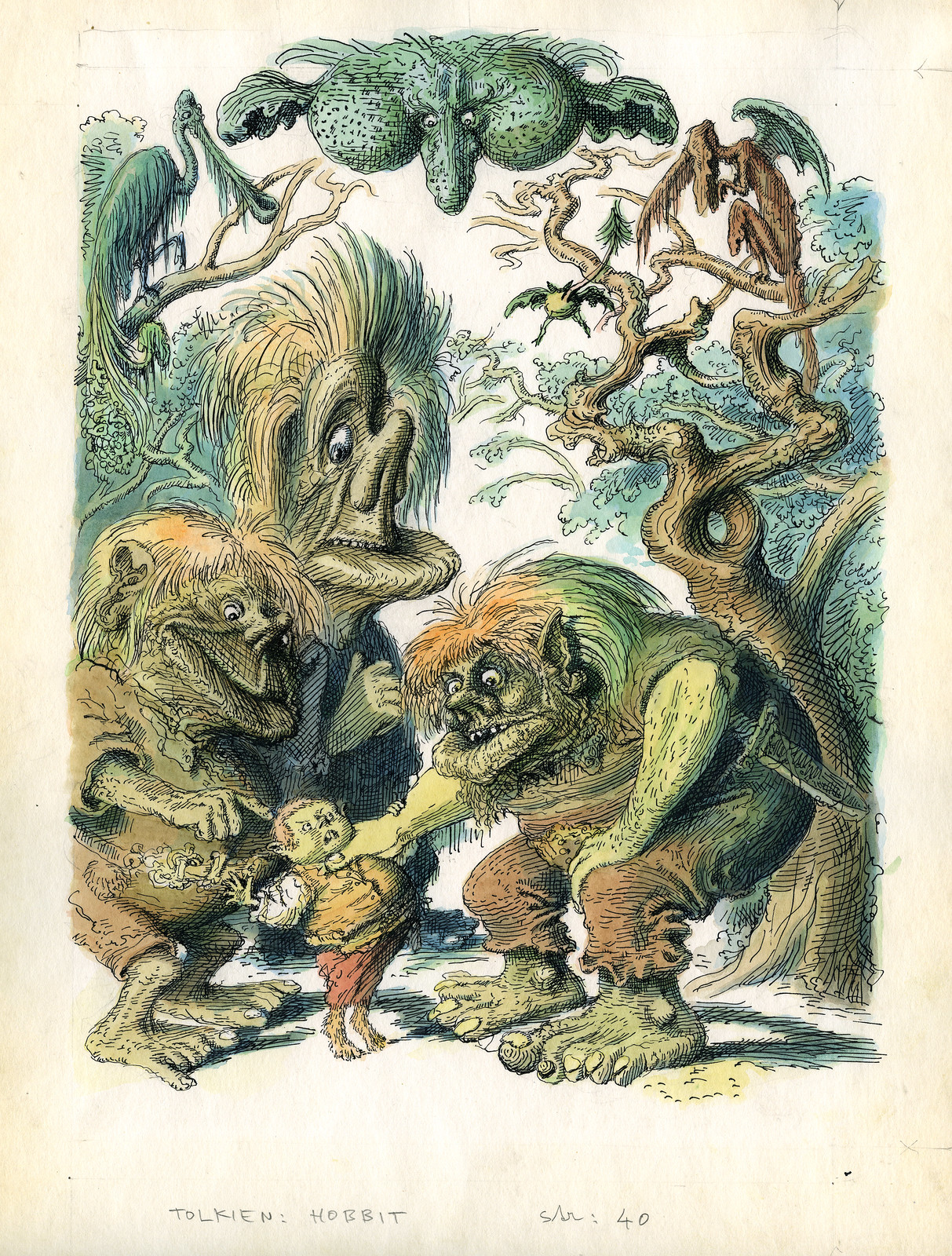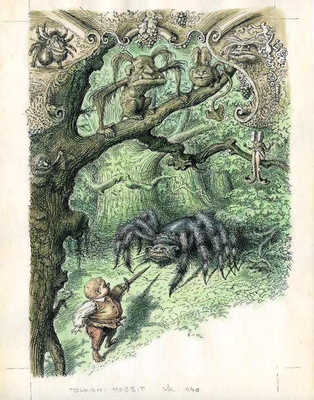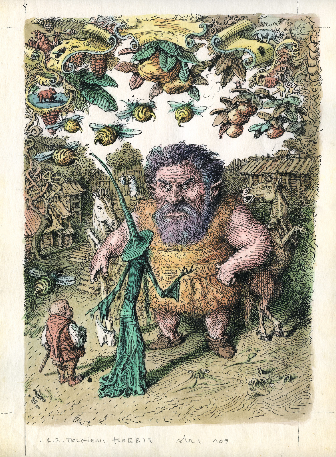 Slovak illustrator Peter Klúcik was commissioned to illustrate a new version of J R R Tolkien’s The Hobbit in 1988. For the project he created 40 illustrations that were rich in detail and quite different from previous works for Tolkien books. Unfortunately, the publishing house commissioning the illustrations lost the right to publish the book. A second publisher approached him, but only for the book’s cover. Then a third publishing house bought the artwork, but also failed to secure rights to the book. So for the last three decades, Klúcik’s wonderful Sendakesque illustrations have been orphaned.