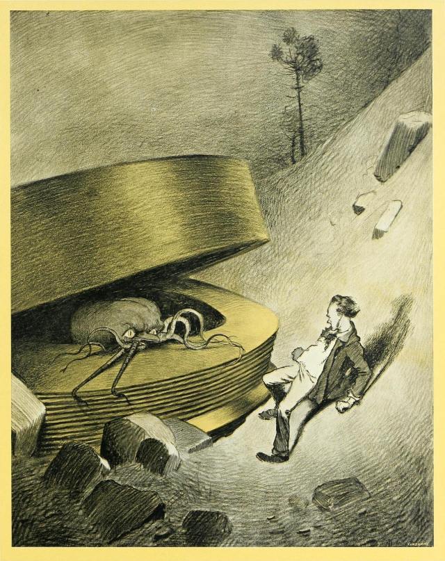 In 1900, The War of the Worlds was published in a French edition, translated by Henry-D. Davray , who specialized in the work of Wells, Kipling, Wilde, and Yeats. This translation was reprinted several times in the following years, but not issued with illustrations until 1906, when Henrique Alvim Corrêa brought his signature style to accompany the text. The Brazilian artist was living and working in Brussels at the turn of the century and was so excited by Wells’ work that he traveled to London in 1903 and pitched his illustrations for a new French language edition directly to the author.