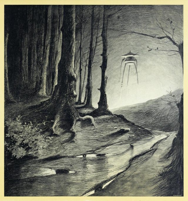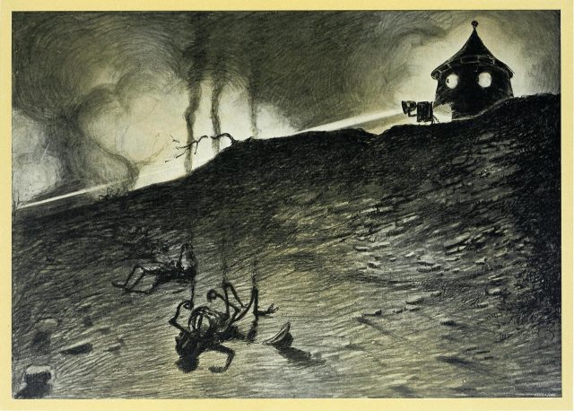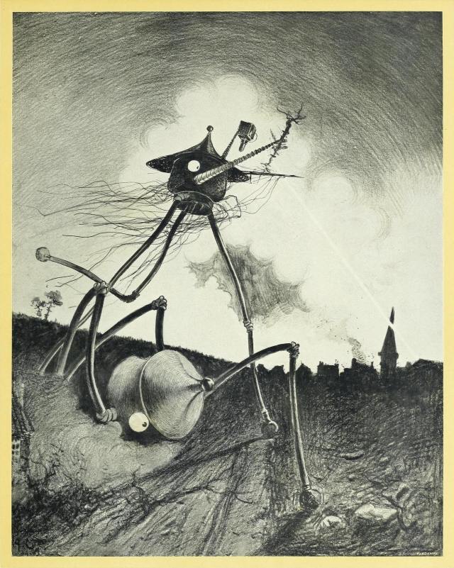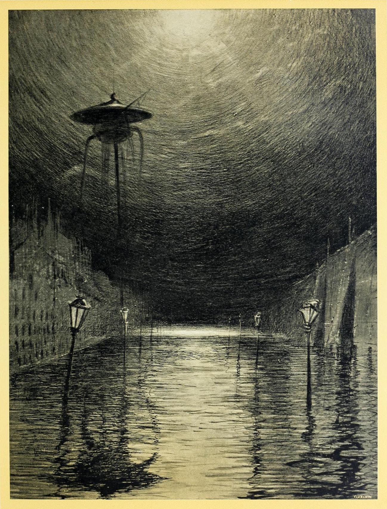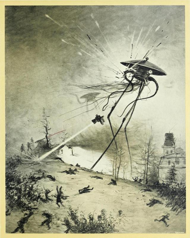 During the past week, I stumbled on three different references to H. G. Wells’ iconic science fiction novel The War of the Worlds, including a new French-British television series (which was mediocre at best). The early sci-fi classic was originally published in 1897 with illustrations by the British artist Warwick Goble. These were murky, black-and-white depictions of Wells’ story of a Martian invasion of Earth.