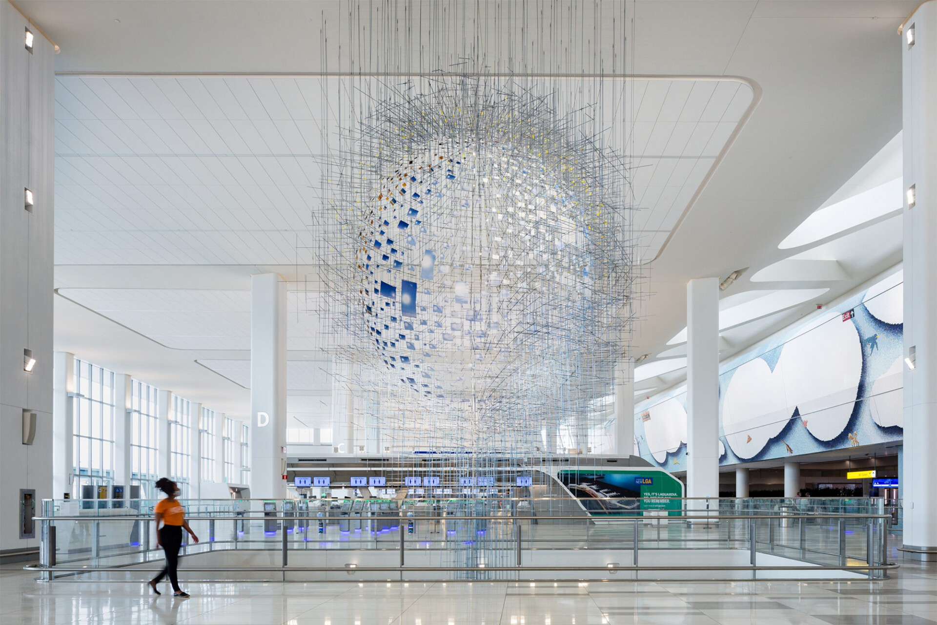 Last week, artist Sarah Sze unveiled an impressive new sculpture titled “Shorter than the Day” —a reference to Emily Dickinson’s poem “Because I could not stop for Death” at New York City’s LaGuardia Airport. Sze’s work, which weighs five tons, is suspended above an atrium in Terminal B.