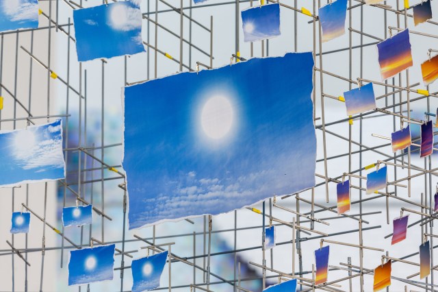 The New York-based artist captures the sky as it changes from cerulean blue morning to a colorful sunset to the many shades of night through nearly 1,000 photographs of the sky. Each printed image is fastened to the aluminum and steel with alligator clips and is revealed as viewers move around the massive work, just like the earth circles the sun to mark a day.