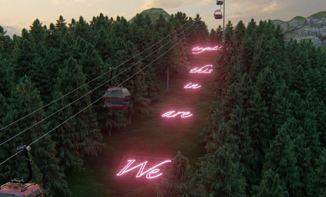 The neon words “We are in this together” will be viewed by riding the free gondola that transports visitors more than 10,000 feet and 8 miles up the mountain from Telluride to Mountain Village. Starting in September, the work will glow with varying degrees of brightness every day for 18 months.