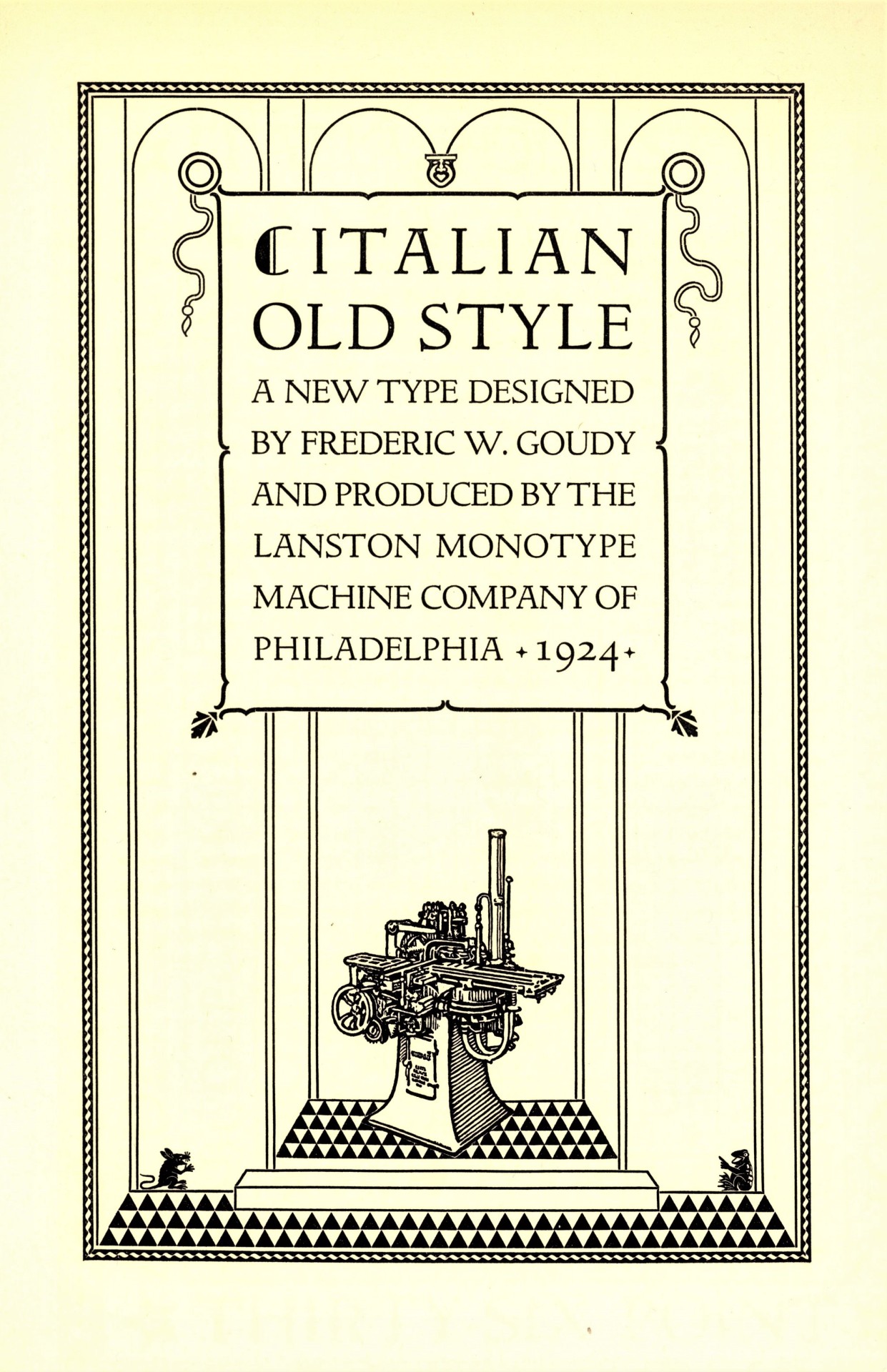 Frederic Goudy’s Italian Old Style typeface as published in the Lanston Monotype Machine Company’s Italian Old Style, A New Type by Frederic W. Goudy, designed by the eminent American typographer and type and book designer Bruce Rogers and printed in Mount Vernon, N.Y., in a second edition of 11,000 copies by William Edwin Rudge in 1924.