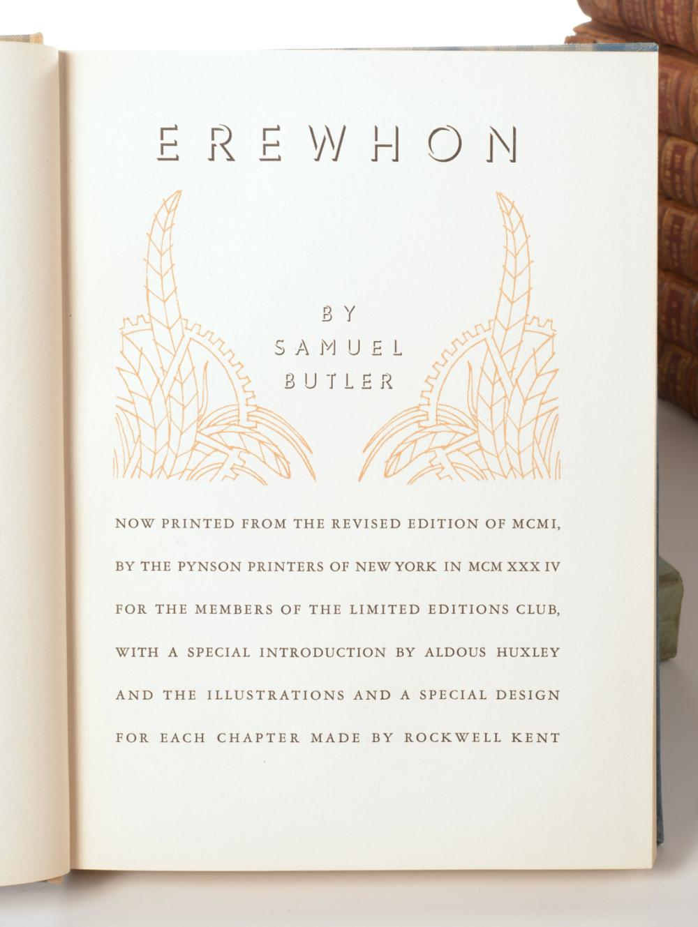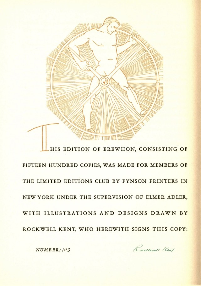 This wonderful volume is the 1934 Limited Editions Club re-issue of Erewhon by the English Novelist Samuel Butler, with a special introduction by Aldous Huxley, and illustrated with 10 color lithographs and reproductions of 30 line drawings by American artist Rockwell Kent. The edition of 1500 copies was hand-set in Garamond types and designed and printed by Elmer Adler at the Pynson Printers’ shop in New York. The binding is full silk, printed with a design by Rockwell Kent, and the edition is signed by the artist.