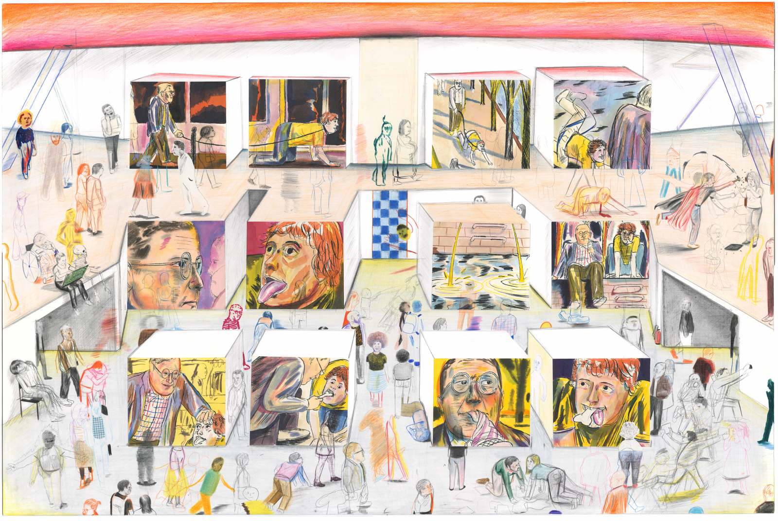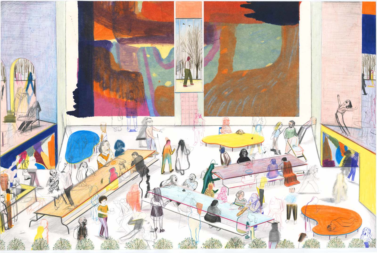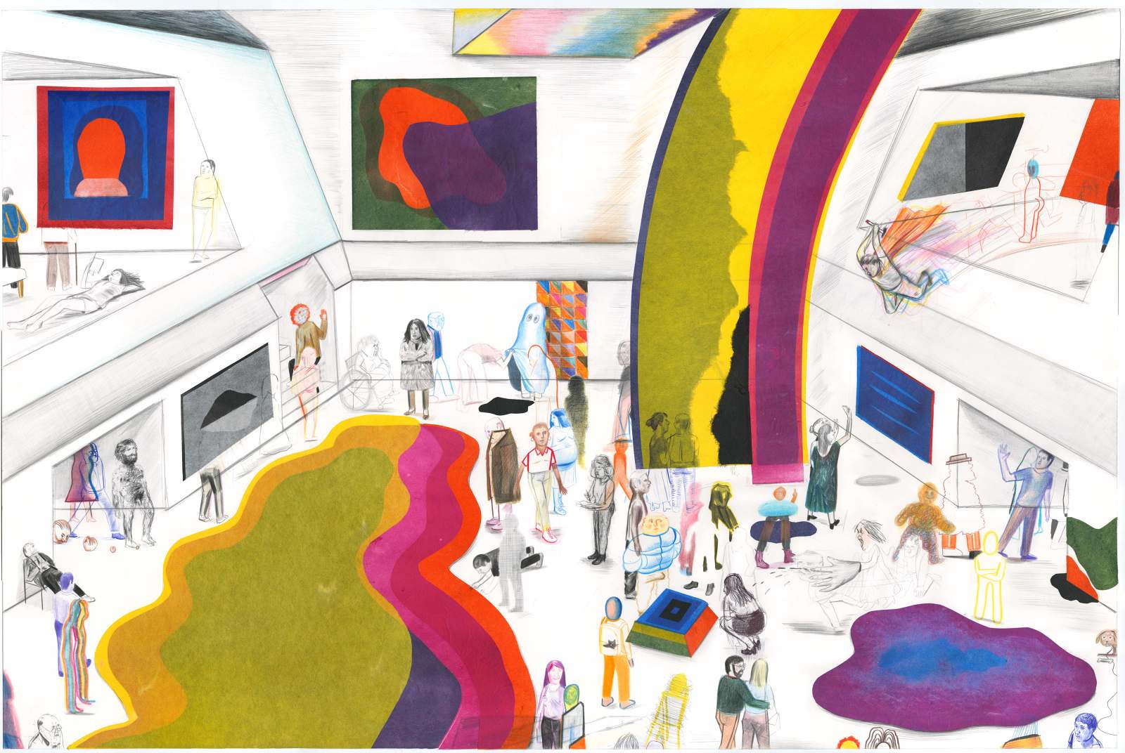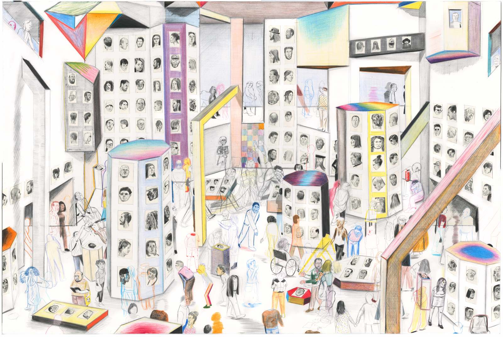 Foundation Kebbi is an imaginary museum created by Paris-based artist and illustrator Yann Kebbi. The fake cultural attraction is populated by the usual crowd of museum goers, tourists, lovers, and time wasters. However, if you look closely, you can also spot super heroes and the grim reaper among the brilliant exhibitions.