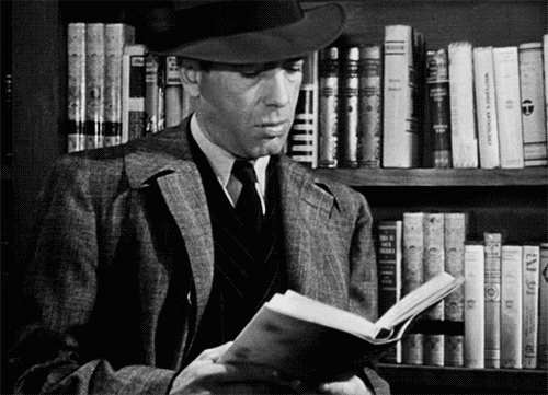 When I stumbled upon the film noir gif below it reminded me what a pivotal role the bookshop Geiger’s Rare Books played in the noir classic. It’s been years since I’ve actually viewed the film, but I got a little kick from the very meta moment when Marlowe is browsing the bookshop and picks up a copy of Chandler’s book.