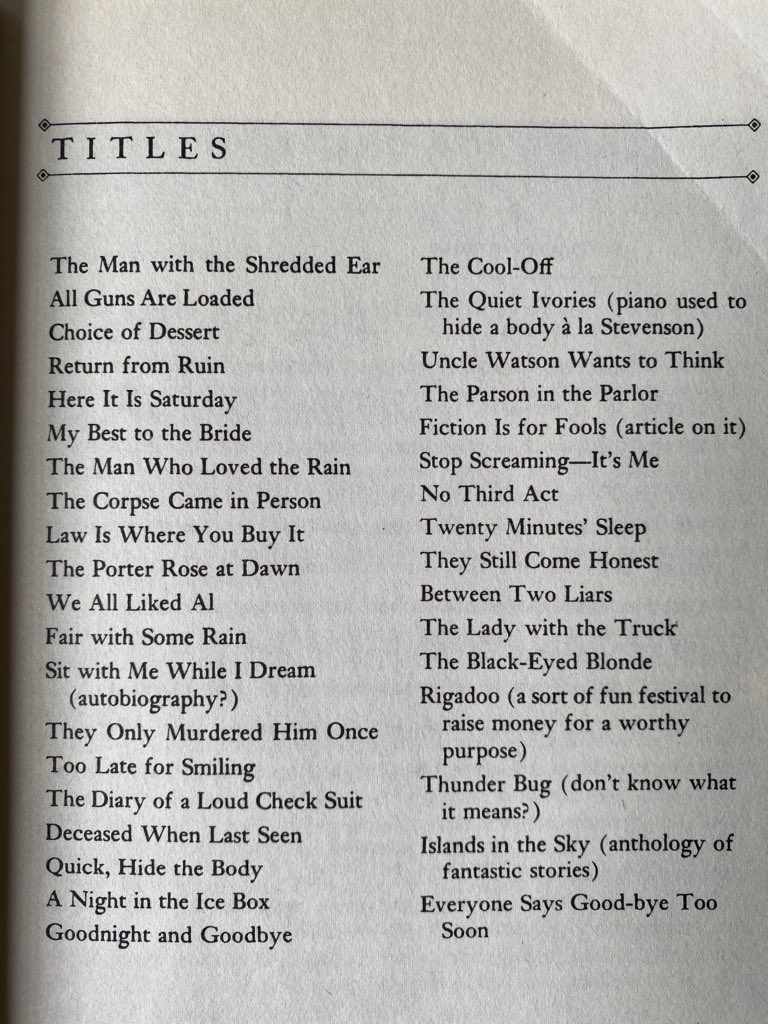 I was tickled by this list of book titles that the great noir writer Raymond Chandler created but never used. The Islands in the Sky was eventually a title by Arthur C. Clarke and The Black-Eyed Blonde was used by both Erle Stanley Gardner of Perry Mason fame and the Irish author John Banville writing as Benjamin Black. I particularly liked Everyone Says Goodbye Too Soon.