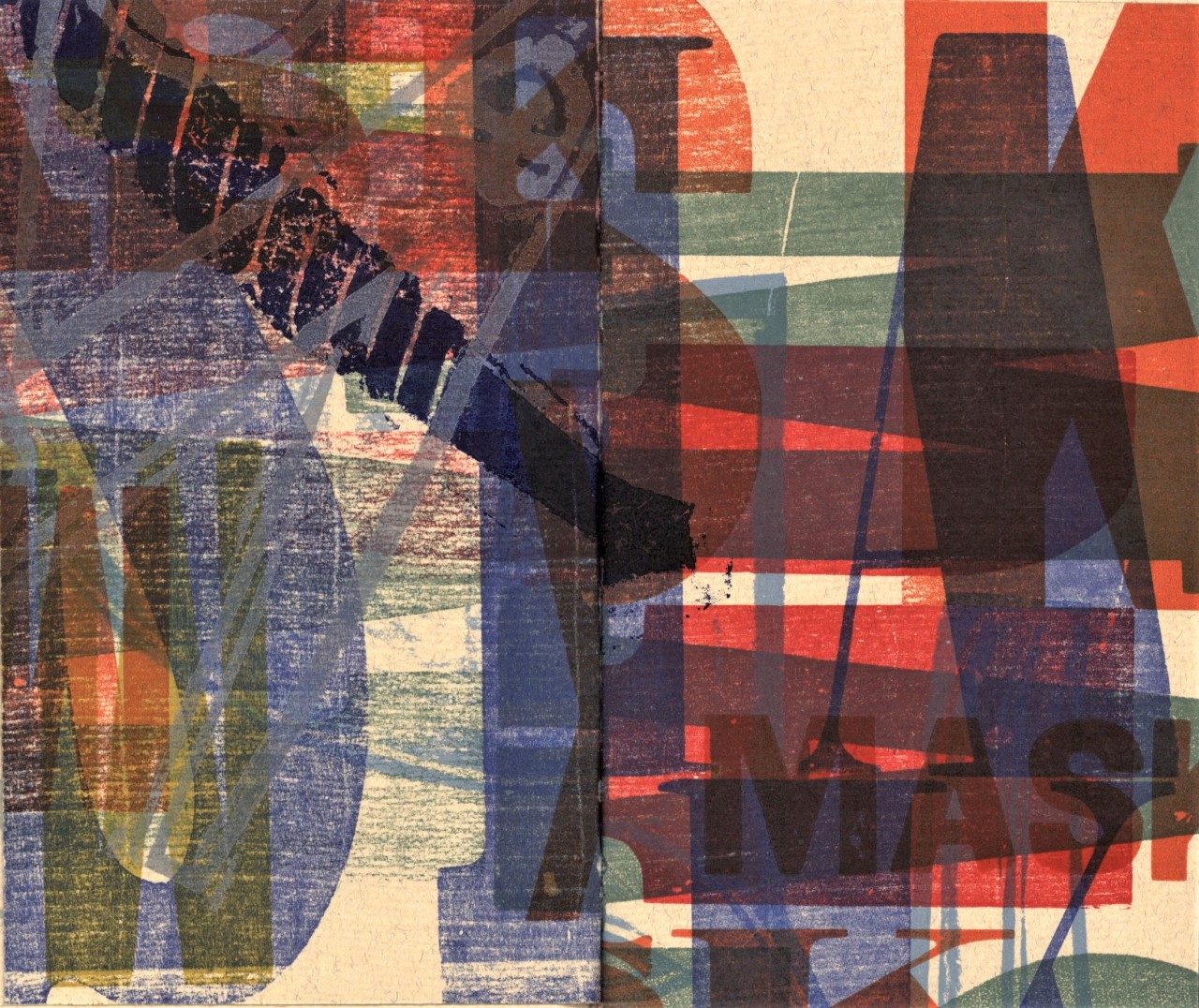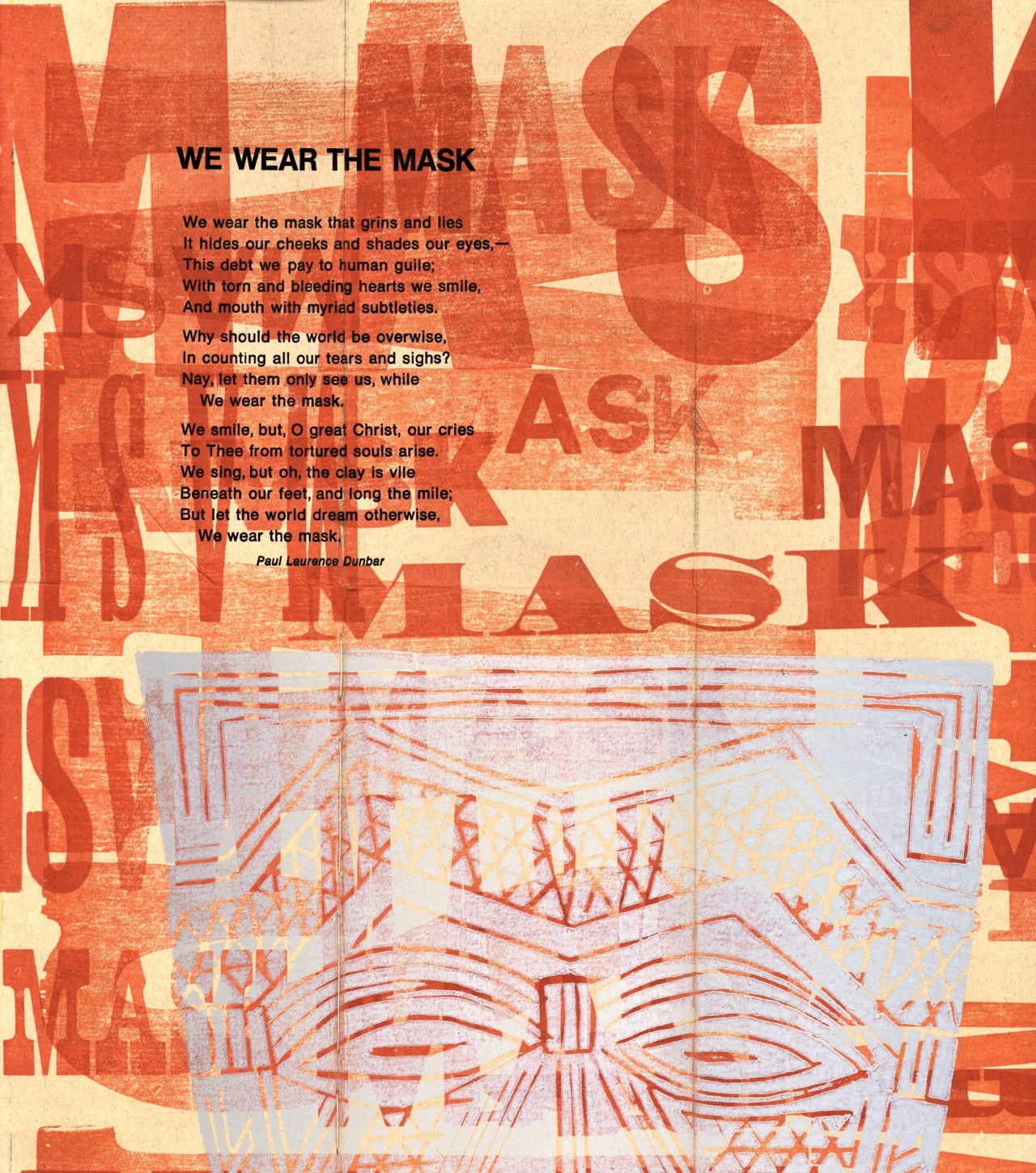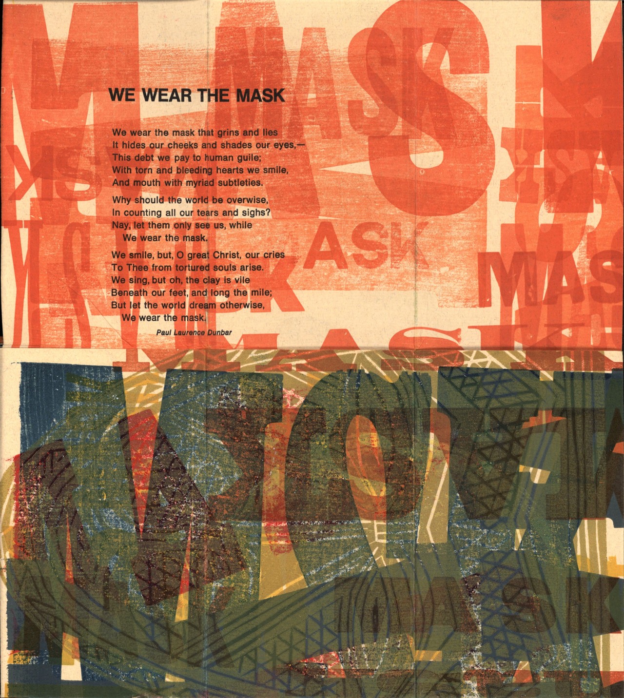 The Mask by Amos Paul Kennedy, Jr,, one of the leading letterpress printers, book artists, and papermakers working in the United States today, was printed at Bloomington, Indiana, in 2000. Nearly all of his work has an Afrocentric focus. Mask features the use of wood and metal type, various definitions for the word “mask,” African mask imagery, multiple fold-out pages, and Paul Laurence Dunbar’s poem “We Wear the Mask.”