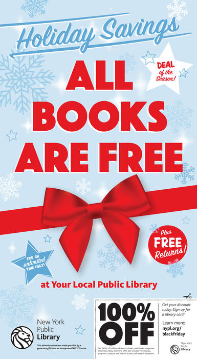 Every year, the New York Public Library publishes humorous Black Friday ads that promote things like free books and 100% off coupons. This Thanksgiving the library offered a “Book Your Dream Getaway.” The “Black Friday travel deal” is an “all-inclusive package” with “millions of destinations” and an “all-you-can-read buffet.” And this year you can “travel free from the kitchen to the couch” without concerns about any travel restrictions. The only passport you need to take advantage of these unbelievable deals is a library card because of course, you’ll be traveling via books.