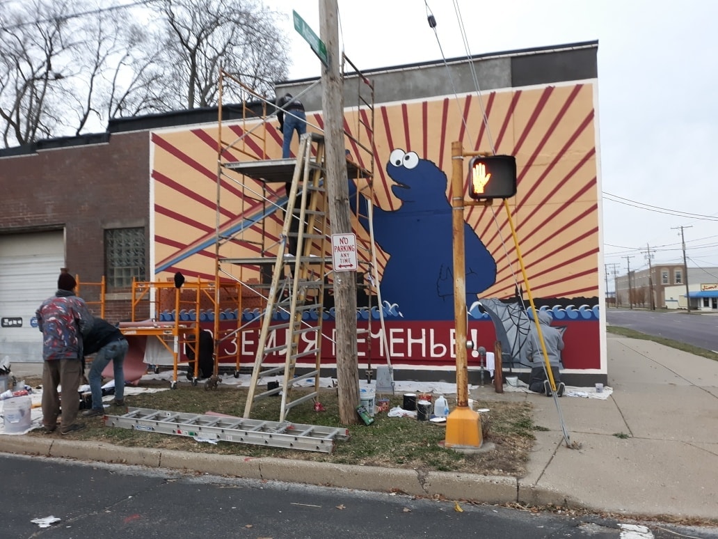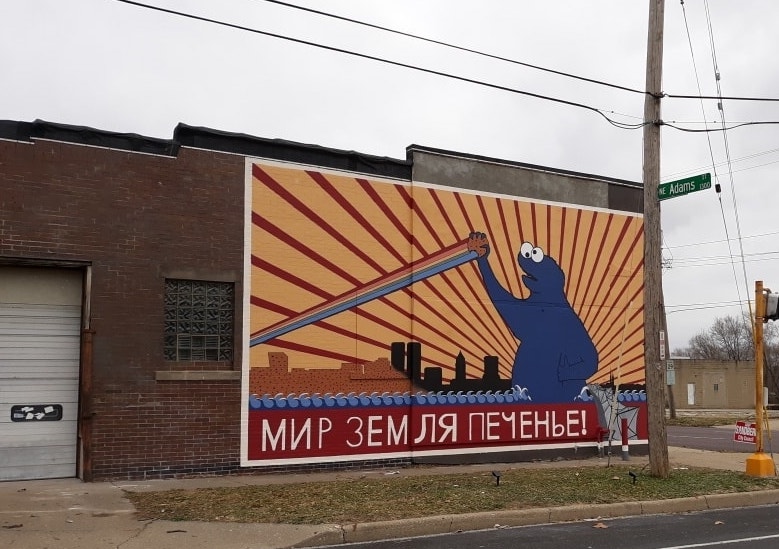 You don’t have to be a street art sucker like me to be intrigued by the tale of the Cookie Monster “мир, земля, печенье” (“Peace, Land, and Cookies” in Russian) mural that popped up on a commercial building in Peoria, Illinois over the Thanksgiving holiday. The mystery stems from the question: Who actually commissioned artist Joshua Hawkins to paint the mural.