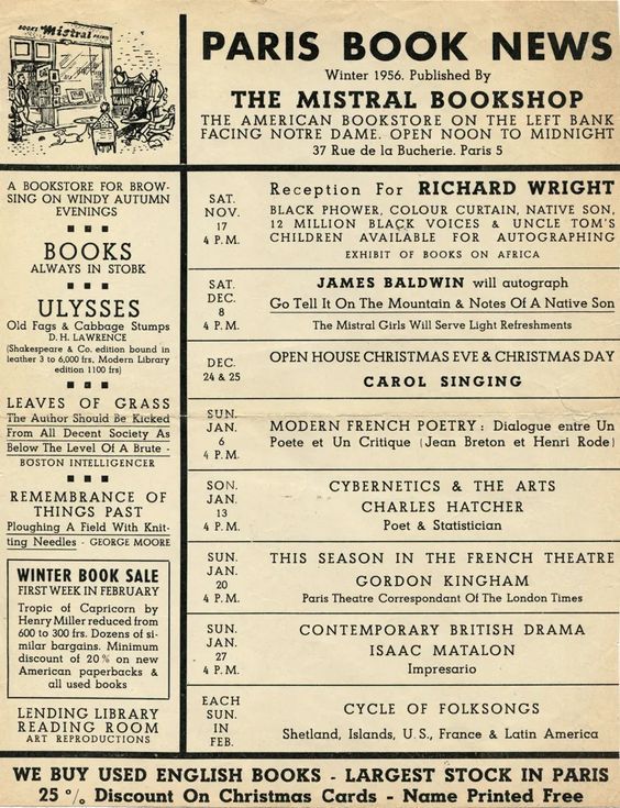 The iconic Paris bookstore Shakespeare and Company has frequently been in the news recently due to a world-wide fund raising effort to save the financially troubled landmark. You may not know that before it got its well known name the store was called the Mistral Bookshop after the chilly, powerful winds that blow through France during winter months. The other day, I was amazed to stumble upon this 1956 flyer for the bookstore which features appearances by Richard Wright and James Baldwin within three weeks of each other. How absolutely fabulous was that.