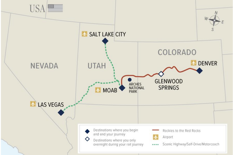A few years ago, I took a road trip around the U.S. southwest. One leg of the journey was a drive between Denver, Colorado and Moab, Utah, with a stop in Glenwood Springs, Colorado along the way. It’s a route that I can wholeheartedly recommend. And by the summer of 2021 you’ll be able to follow the same route on a luxury, glass-domed train run by the folks who own the iconic Rocky Mountaineer train in western Canada.