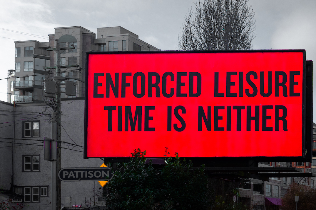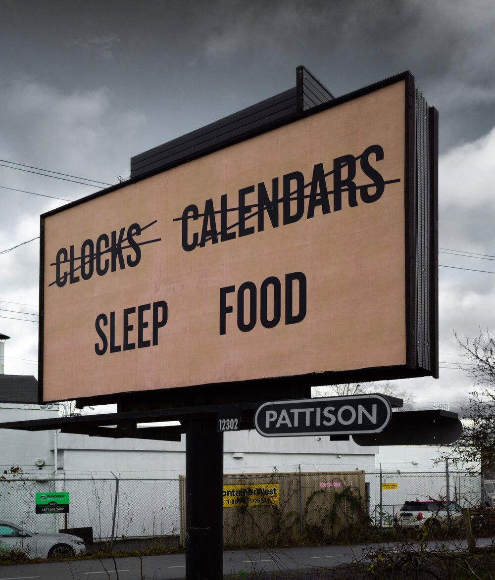 A series of prophetic slogans was first conceived by Coupland in 2011, but are ironically fitting for these pandemic times. Enforced Leisure Time is Neither proclaims itself on a bold red background in front of an apartment complex. Doing Nothing is Very Different from Having Nothing to Do shouts loudly on a bright fuchsia background billboard. Everybody on Earth Is Feeling the Same Way As You was amazingly prescient.
